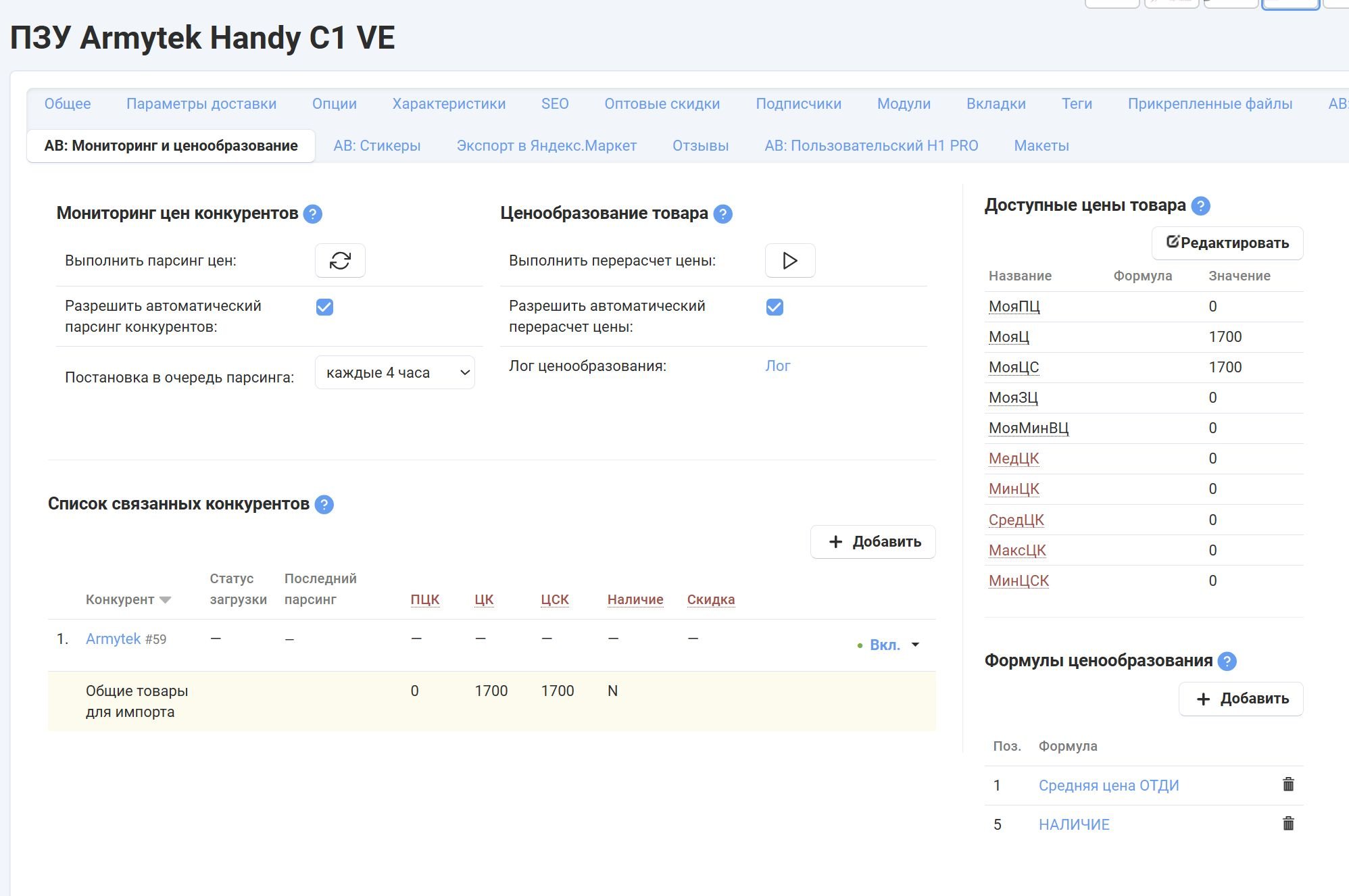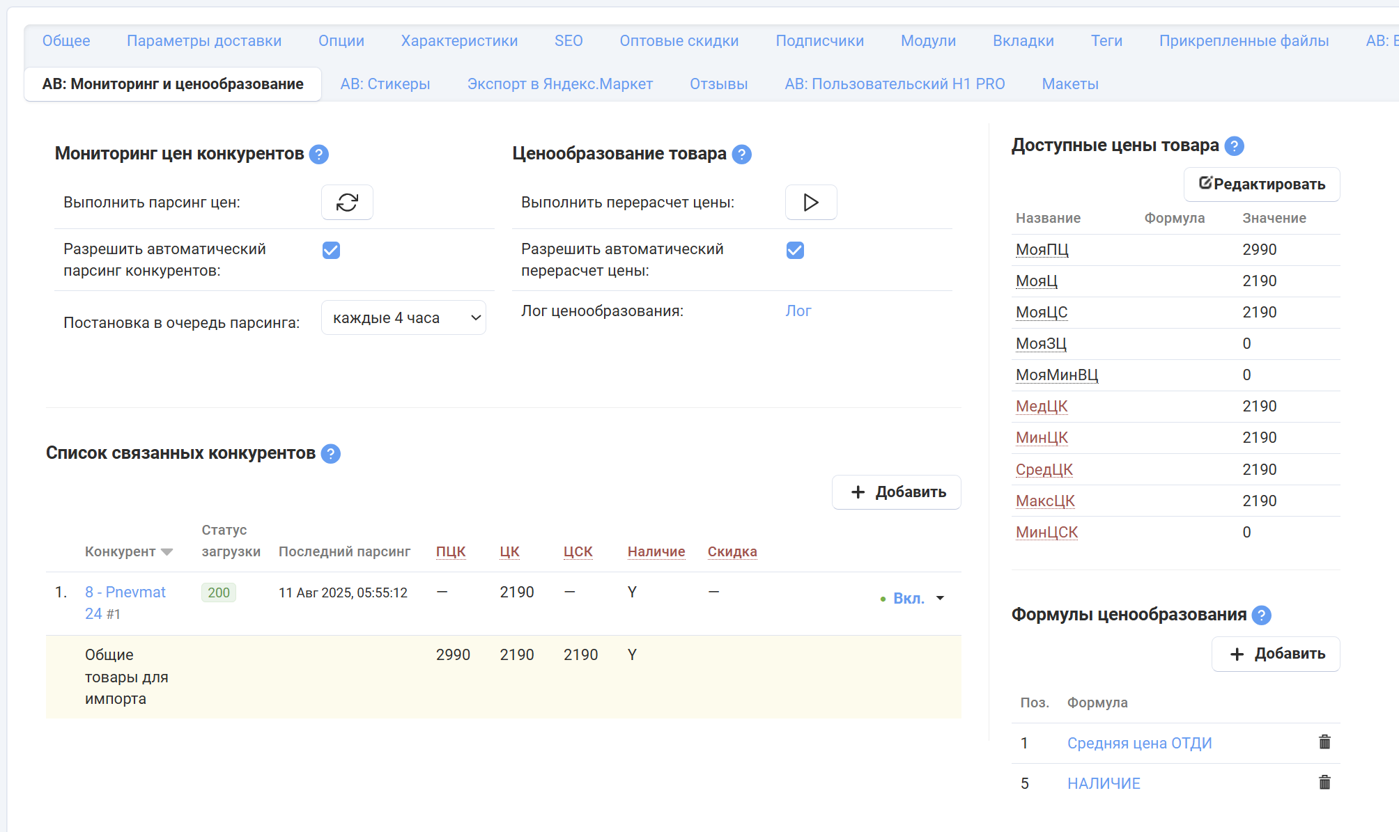 @ab.support.serhii Так все просто, со вкладки Импорт взял файл и его тут же загрузил через вкладку экспорт на другой витрине. @AndreyJ Да, сейчас обратил внимание, что нету полей соответствия 1 - Разрешить автоматический парсинг конкурентов 2 - Разрешить автоматический перерасчет цены 3 - Формулы ценообразования @ab.support.serhii А планируете добавлять такой функционал?