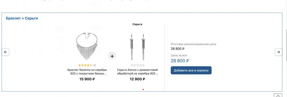 10. А не планируете ли вы уделить немного внимания визуальному оформлению "Комбинации товаров". А то на фоне всей красоты сильно выделяется (пространства много пустого и не задействованного, повторение итоговой цены два раза когда за комбинацию скидок нет, знак плюс немного сьехал) пример тут https://stile.me/braslety/braslet-ravenna-iz-serebra-925-s-pokrytiem-belym-rodiem/