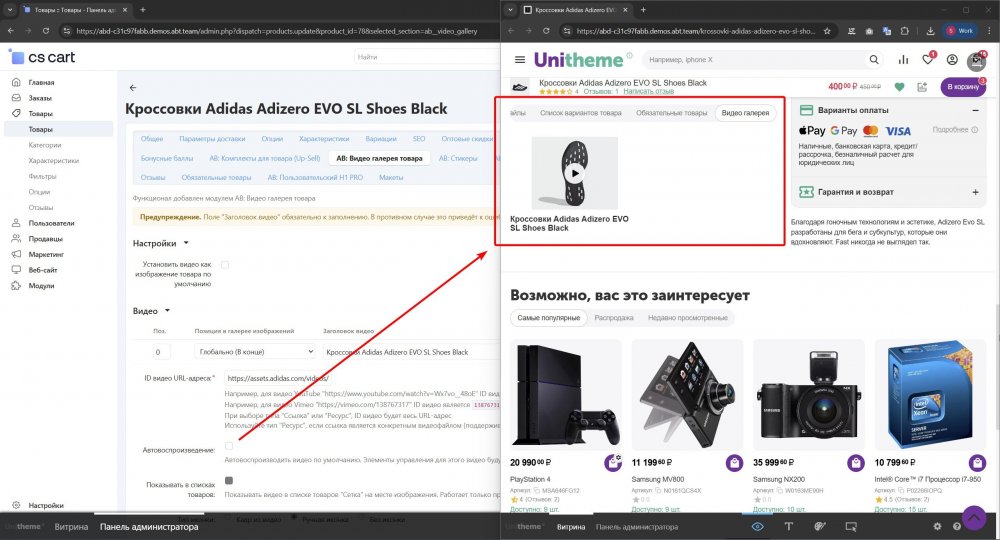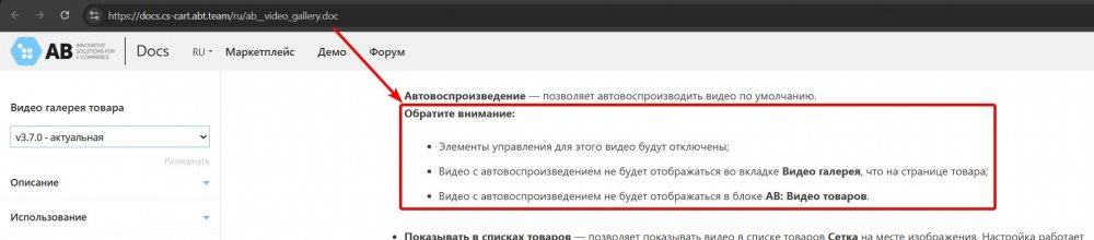 Раздел "Видео галерея товара": https://community.abt.team/forum/14-video-gallery-of-the-product/ У этого товара было включено автовоспроизведение. При этом видео не выводится во вкладке Видео галерея, что на странице товара. А так, как видео только одно, то не выводится и вкладка. Это чётко описано в документации: https://docs.cs-cart.abt.team/ru/ab__video_gallery.doc
