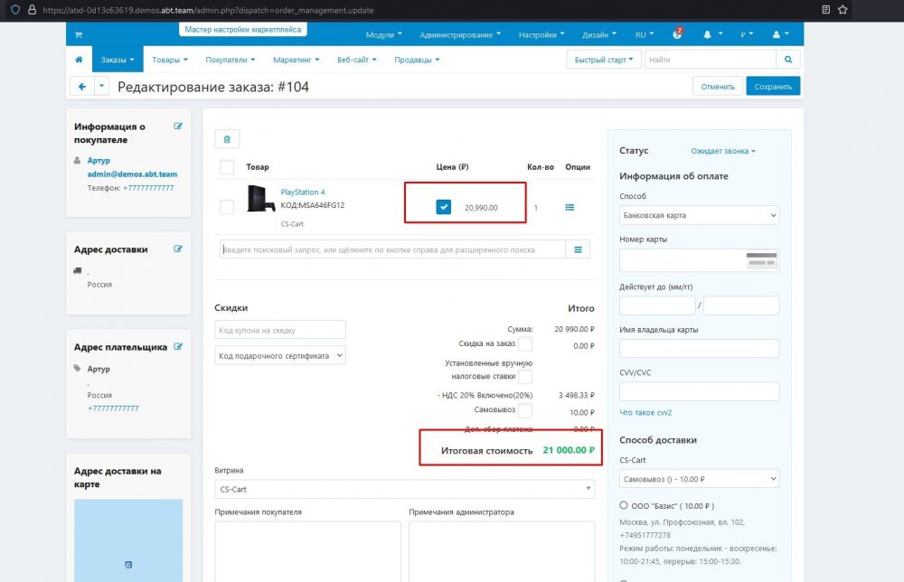 Здравствуйте! Столкнулся с такой проблемой, скорее всего это к cs-cart но модуль то ваш )) У нас нас сайте при заказе от 100 тмт доставка бесплатная. Стоимость товара 156 тмт значит доставка бесплатная, Итог 156.50 тмт. Ииду в заказы-заказы и далее редактировать и там вижу вообще другую сумму 176.50 почему считаем доставку 20 тмт если доставка у нас бесплатная стоит?!