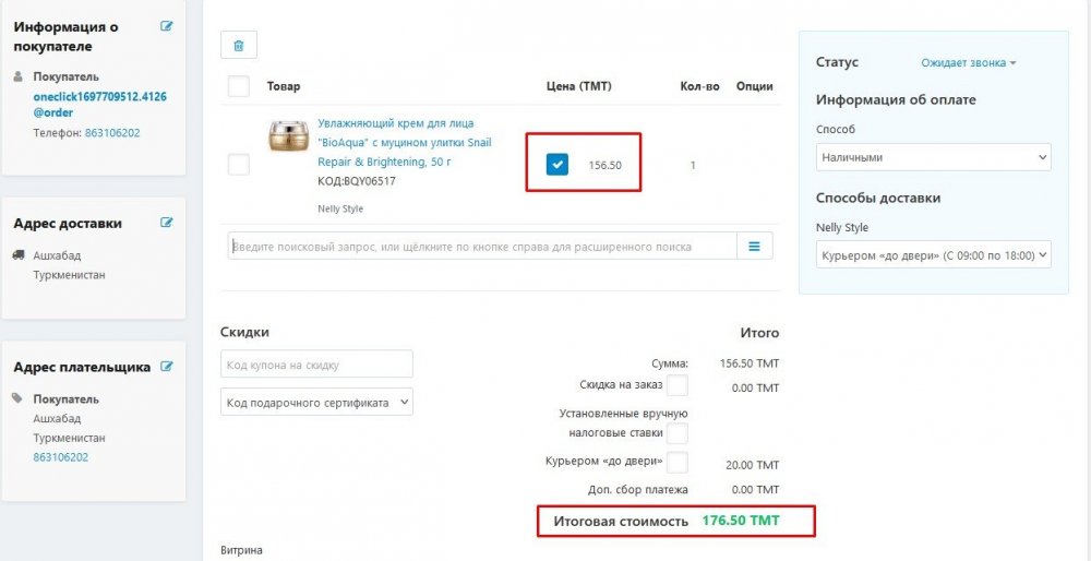 @ab.support.serj курьером до двери, (скрин) при размещении заказа сразу выбирает данный способ доставки, а данная доставка бесплатная если заказ свыше 100 тмт. Такая же проблема и тут: https://forum.cs-cart.ru/t/pokupka-v-odin-klik-nepravilno-schitaet-itogovuyu-summu/22722 Видео записал, отрубил модуль "Заказ в один клик" включил ваш модуль "Быстрый заказ по телефону" точно такая же проблема. Вот видео, на демке воспроизвел: https://disk.yandex.ru/i/vlf5SdqvkyDAiw на видео показана работа "Заказа в один клик" но и в вашем модуле аналогичная проблема. С уважением, Артур.