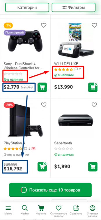 Например, сделать по умолчанию: Для названия заложить сразу две строки, чтобы рейтинг и статус наличия не смещался. Лично у нас отображается даже три строки по умолчанию, но это наш конкретный случай. Либо сделать привязку по нижнему краю, к цене, а не к названию. Для акционной цены (моб версия) задать правило отображение в две строки, место позволяет.