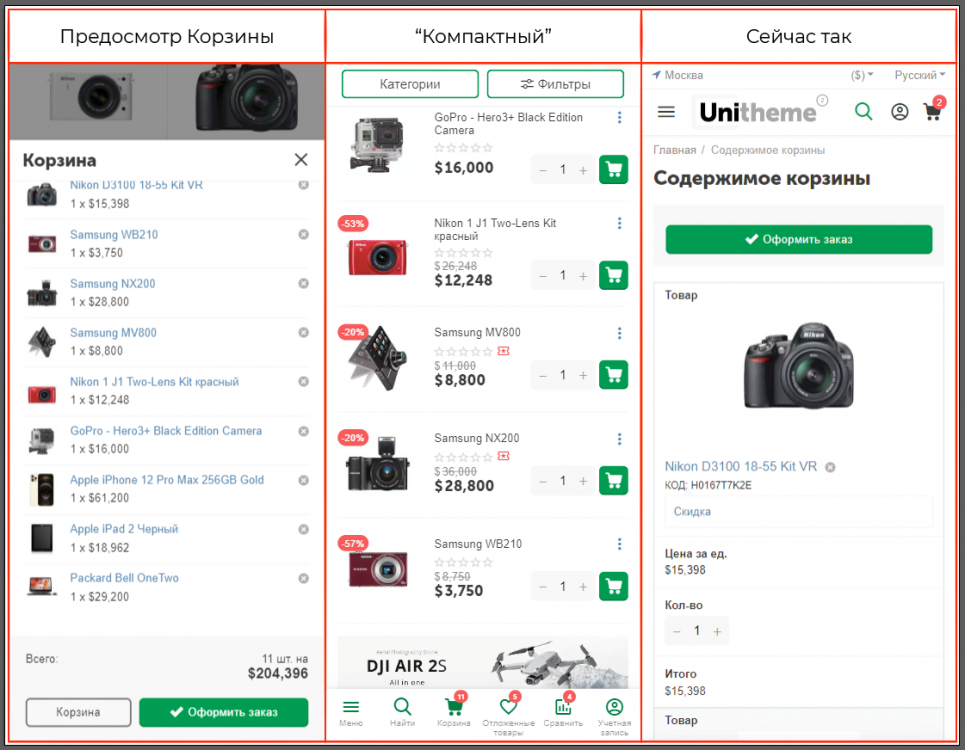 Оформить список товаров на странице Корзина визуально схожим с тем, как этот список отображается по клику на иконку Корзина в нижней панели (Предосмотр Корзины) или как вариант, отображение товаров в категориях при варианте "Компактный". Во втором варианте дополнительно отображается информация о скидках, что мотивирует его оставить в заказе или напоминает/объясняет почему он там оказался. Таким образом в Корзине на экране может отображаться от 5 до 9 товаров сразу, что куда нагляднее, чем сейчас, когда на экране помещается всего один товар (Сейчас так), это нерациональное использование площади экрана и усложняет оформление/проверку заказа перед его размещением, особенно, если в Корзине 5-10-20 и более товаров, что в нашем случае не является редкостью.