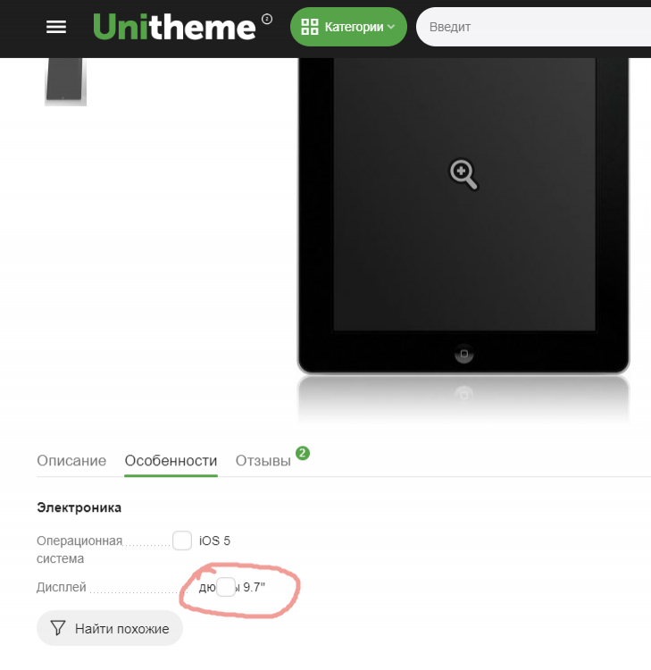 Чекбокс "Найти похожие" наезжает на префикс у характеристик. Воспроизвёл на демо: https://abd-022054e003.demos.abt.team/ru/elektronika/kompyutery/planshety/apple-ipad-2-chernyy/