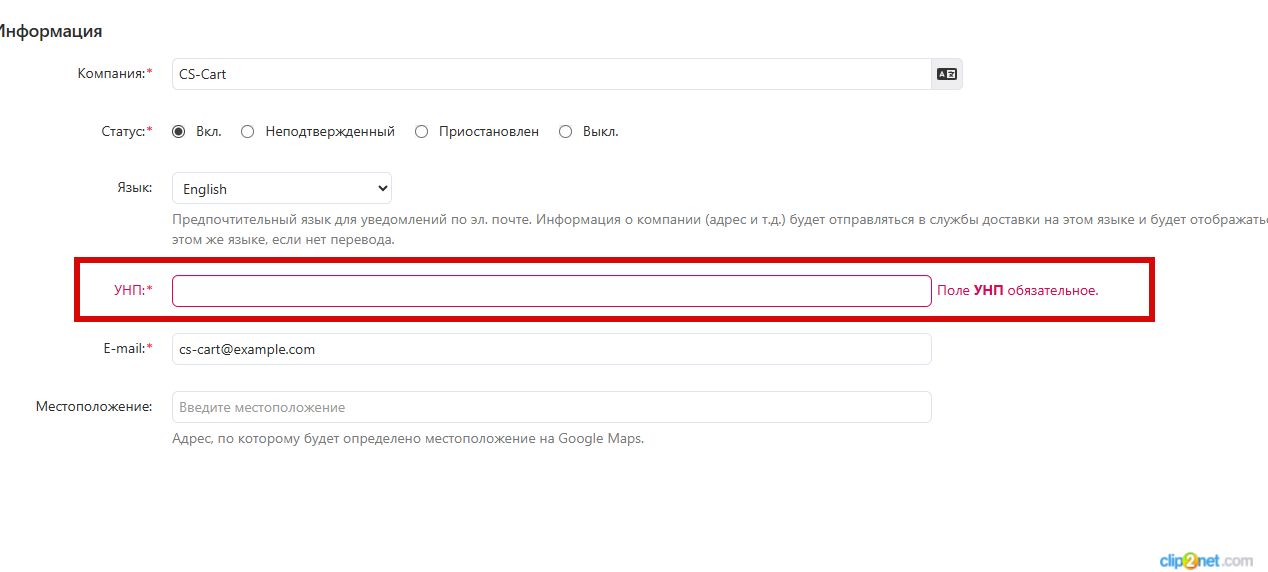 Поле УНП обязательное