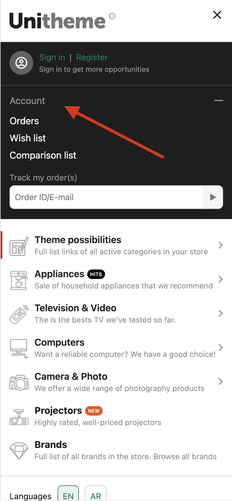 Аккаунт в мобильном доступен в FLY-меню, также можно в нижней панели вывести его (в настройках темы). Большое количество иконок в хедере не очень хорошо, только если у вас компактный логотип.